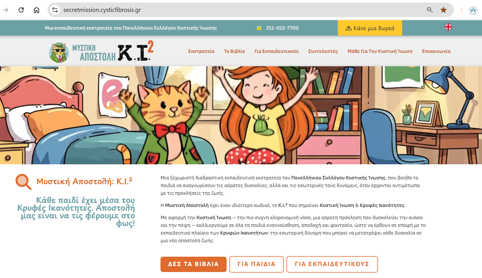Η εκπαιδευτική εκστρατεία «Μυστική Αποστολή: Κ.Ι.²» αποτελεί πρωτοβουλία του Πανελλήνιου Συλλόγου Κυστικής Ίνωσης και φέρει τη δημιουργική υπογραφή της συγγραφέα και εικονογράφου Λιάνας Δενεζάκη, η οποία με ευαισθησία, φαντασία και βαθιά γνώση του παιδικού κόσμου μετέτρεψε μια δύσκολη πραγματικότητα σε ένα φωτεινό και ενδυναμωτικό αφήγημα για τα παιδιά.