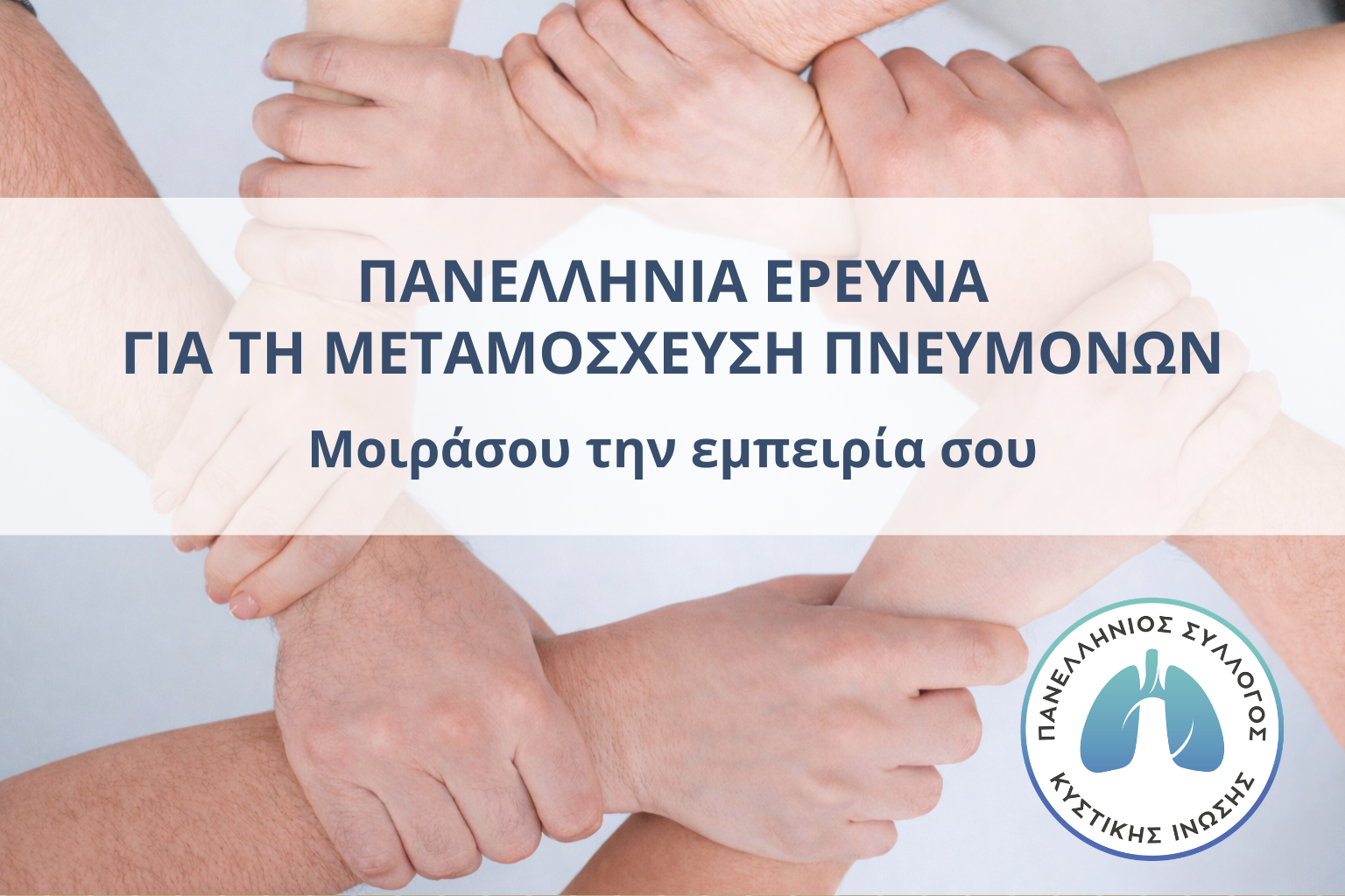 Πανελλήνια έρευνα καταγραφής εμπειριών και απόψεων της κοινότητας σχετικά με τη μεταμόσχευση πνευμόνων στην Ελλάδα πραγματοποιεί ο Πανελλήνιος Σύλλογος Κυστικής Ίνωσης. Η έρευνα υλοποιείται στο πλαίσιο της Ομάδας Εργασίας Μεταμόσχευσης Πνευμόνων και απευθύνεται σε: