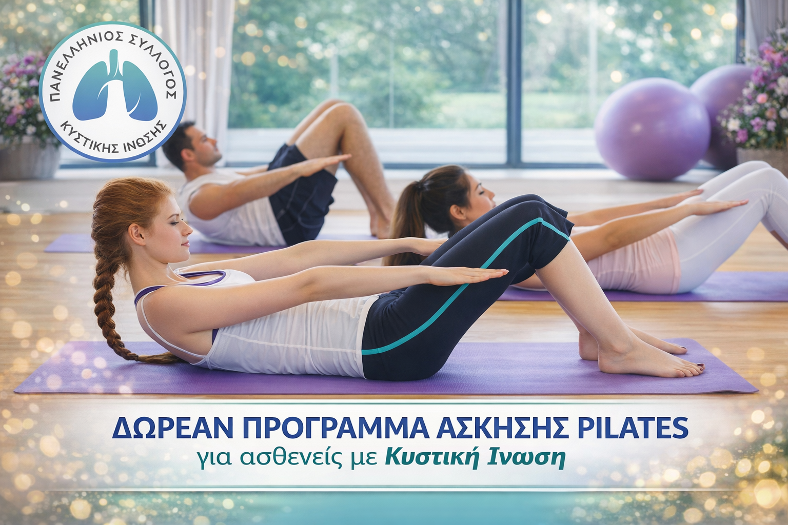Ο Σύλλογος, σε συνεργασία με τη σχολή χορού DanceNikol, προσφέρει ένα δωρεάν καινοτόμο ομαδικό πρόγραμμα Pilates, ειδικά σχεδιασμένο για ασθενείς με Κυστική Ίνωση & μεταμοσχευμένους όλων των ηλικιών. Το πρόγραμμα βασίζεται στο κλασικό Mat Pilates, το οποίο στοχεύει στην: