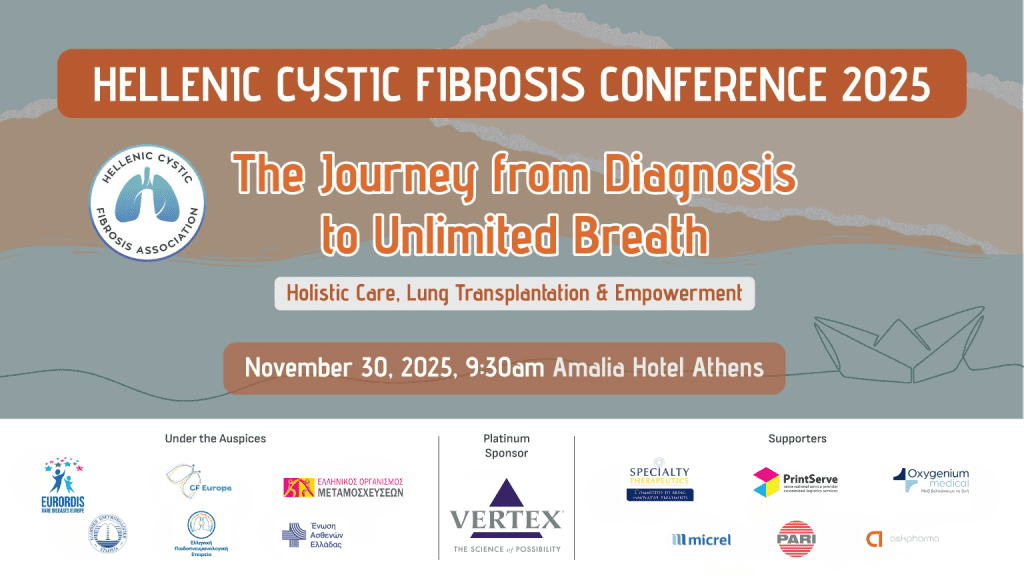 The Conference is organized by the Panhellenic Cystic Fibrosis Association in the framework of the European Cystic Fibrosis Day, under the auspices of the Hellenic Transplantation Organisation and the Hellenic Lung Association, the Hellenic Paediatric Pulmonology Society, EURORDIS – Rare Diseases Europe, CF Europe and the Greek Patients’ Association and with the support of Vertex Pharmaceuticals – Platinum Sponsor and Specialty Therapeutics, PrintServe, PARI, Oxygenium, Micrel, AskPharma.